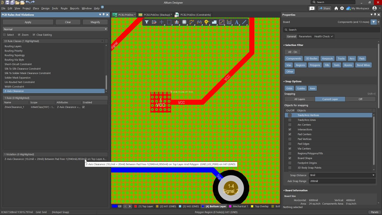 The Z-axis clearance rule allows you to check the shortest distance between copper across layers by defining clearances between specific net classes, differential pairs, or even by applying schematic parameter directives.