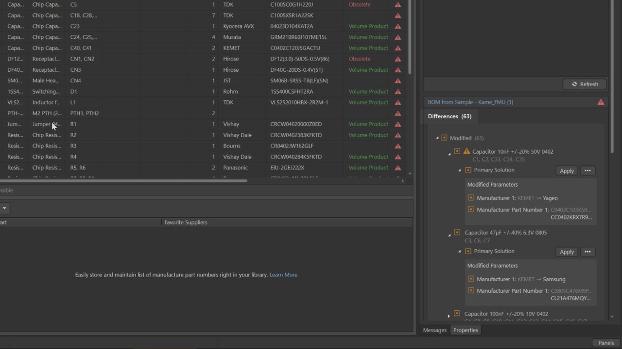 Through the Altium 365 Workspace, designers and procurement specialists can collaborate on related BOM snapshots, allowing for detailed comparisons between managed BOMs and the design’s ActiveBOM.
