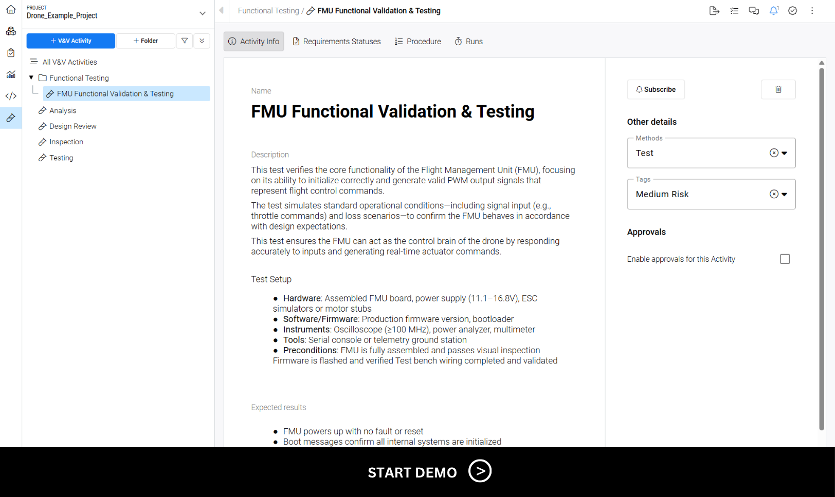 Build complete verification, validation, and testing plans with clear requirements traceability. Track progress in real time so multidisciplinary experts can catch issues early and resolve them without relying on formal check-ins.