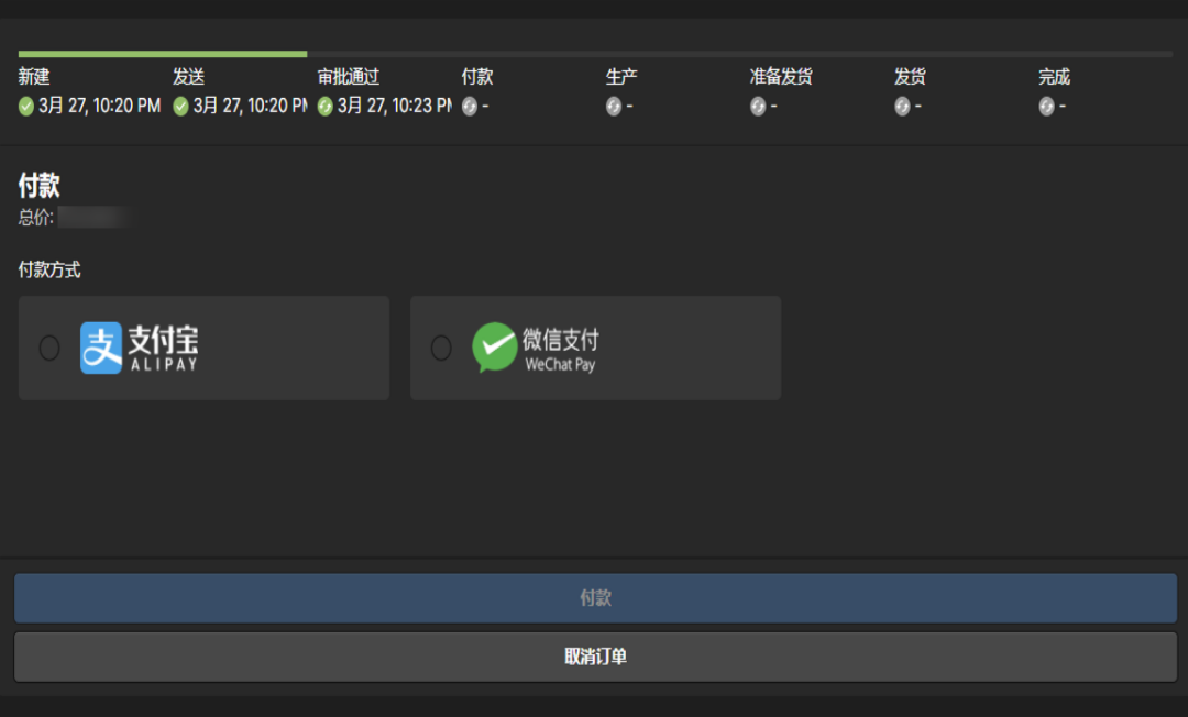 支付完成后,订单即进入生产环节,您可以在概述页面上查看当前总订单的生产进度,也可进入到相关子订单页面查看具体细节。