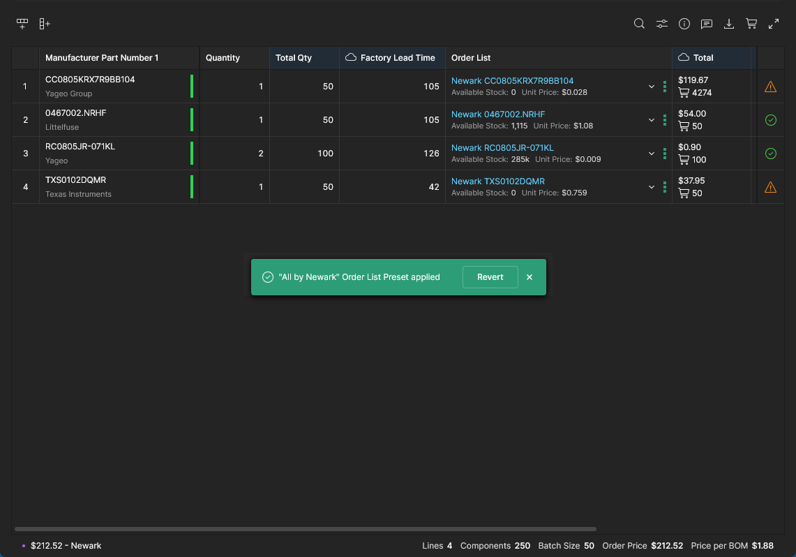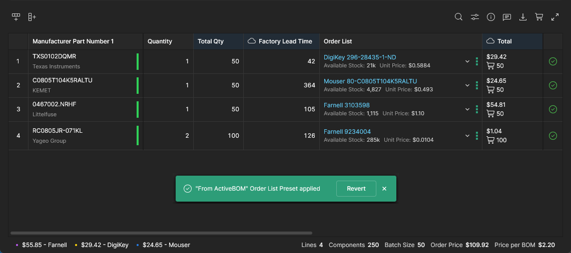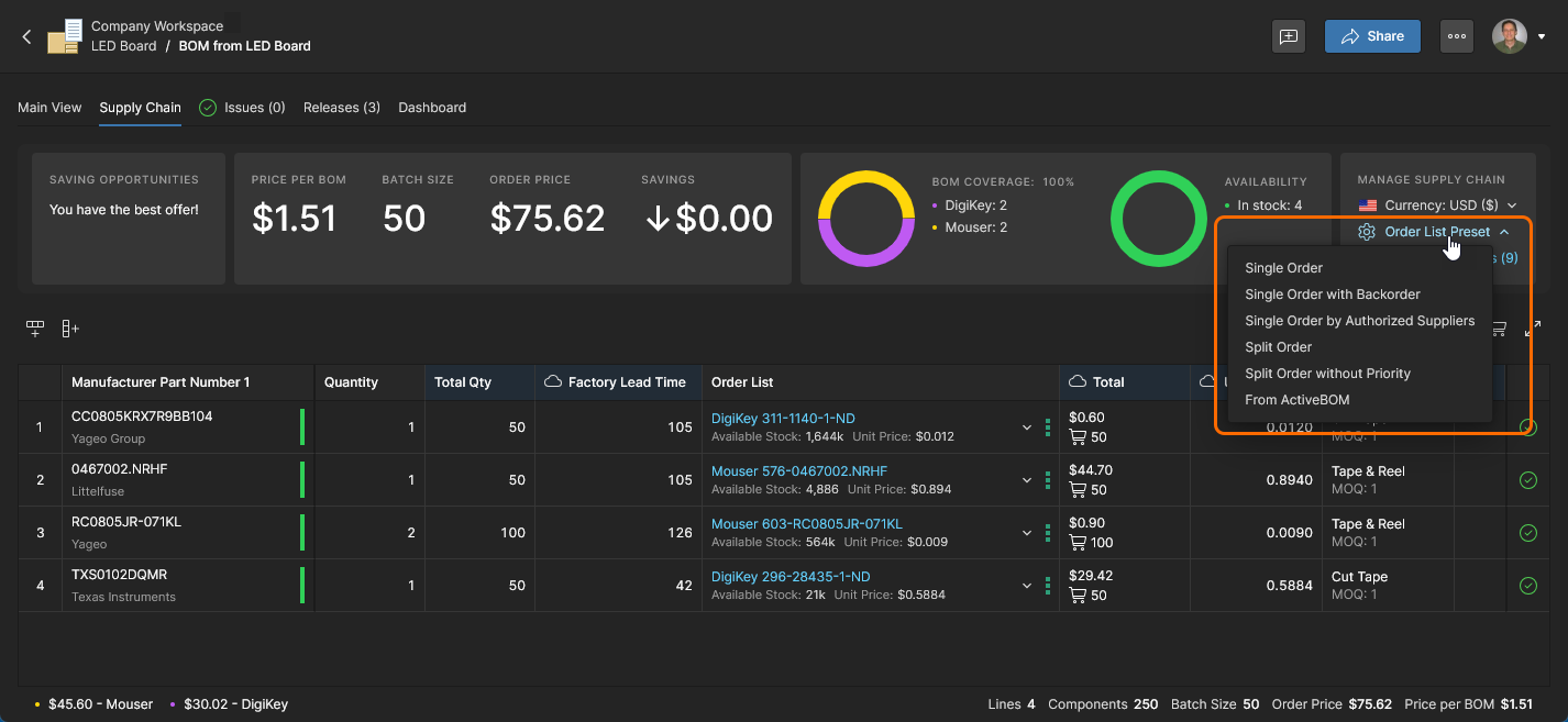 在 Supply Chain view 中使用 BOM 的 Order List Preset 菜单,可更改用于确定 BOM 采购 Order List 条目将采用哪些供应商器件的条件。