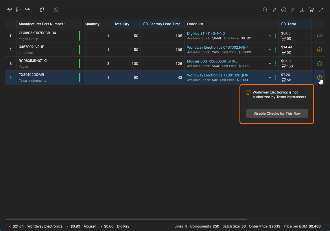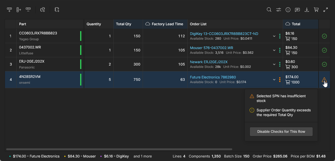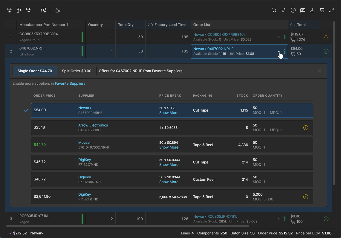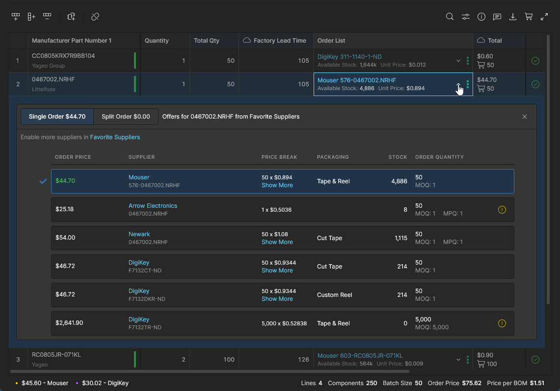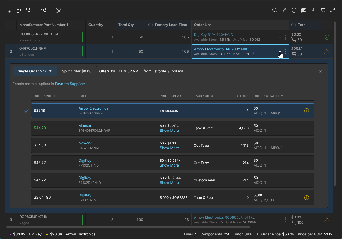 默认情况下,Order List 会由已启用供应商中可用的最低成本选项填充,但会受器件供应因素(如库存水平和最小订购量)的约束。这种标准安排被视为 Single Order 采购清单,其中 BOM 条目包含单一供应商方案;相对地,Split Order 清单中的 BOM 条目可包含多个供应商方案(见下文)。