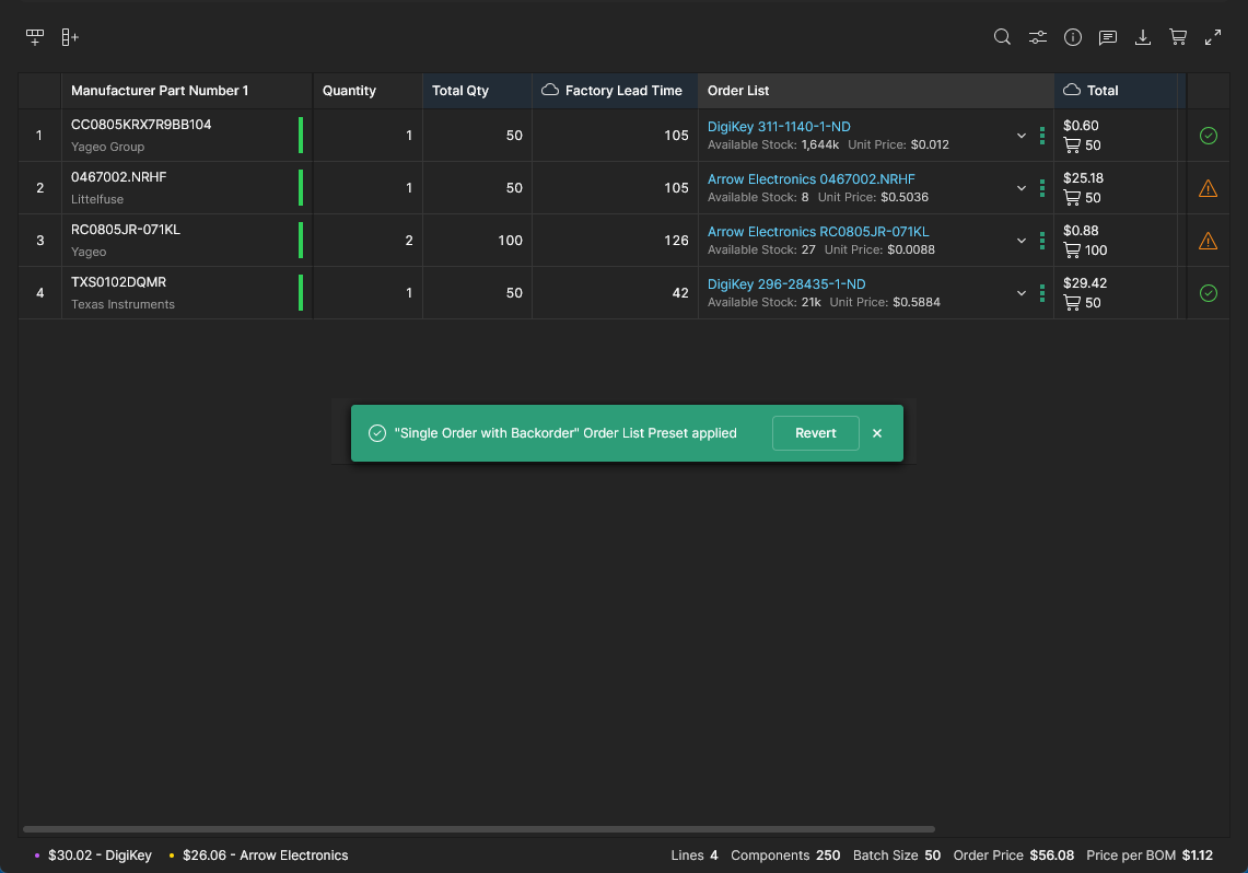 Single Order with Backorder – 无论库存水平如何,均使用最低成本报价。适用于在不受时间限制影响时,确保获得尽可能低的 BOM 订单成本。BOM 器件可保持在订购状态,直到有货。