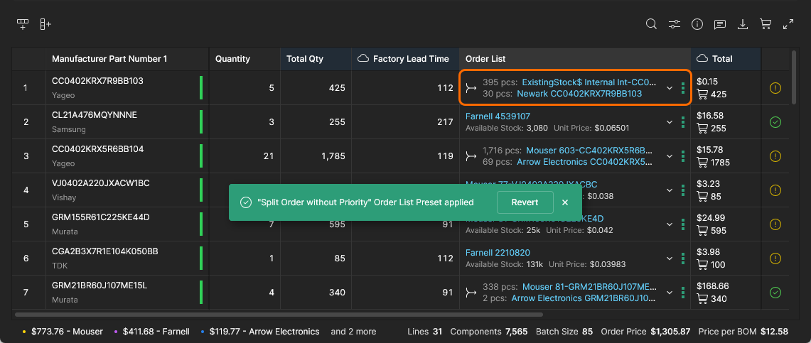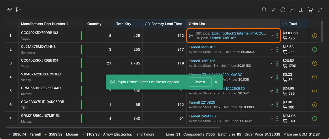 Split Order – 如果能带来成本优势或库存补齐优势,则对某个 BOM 行 Order List 应用多个供应商报价。