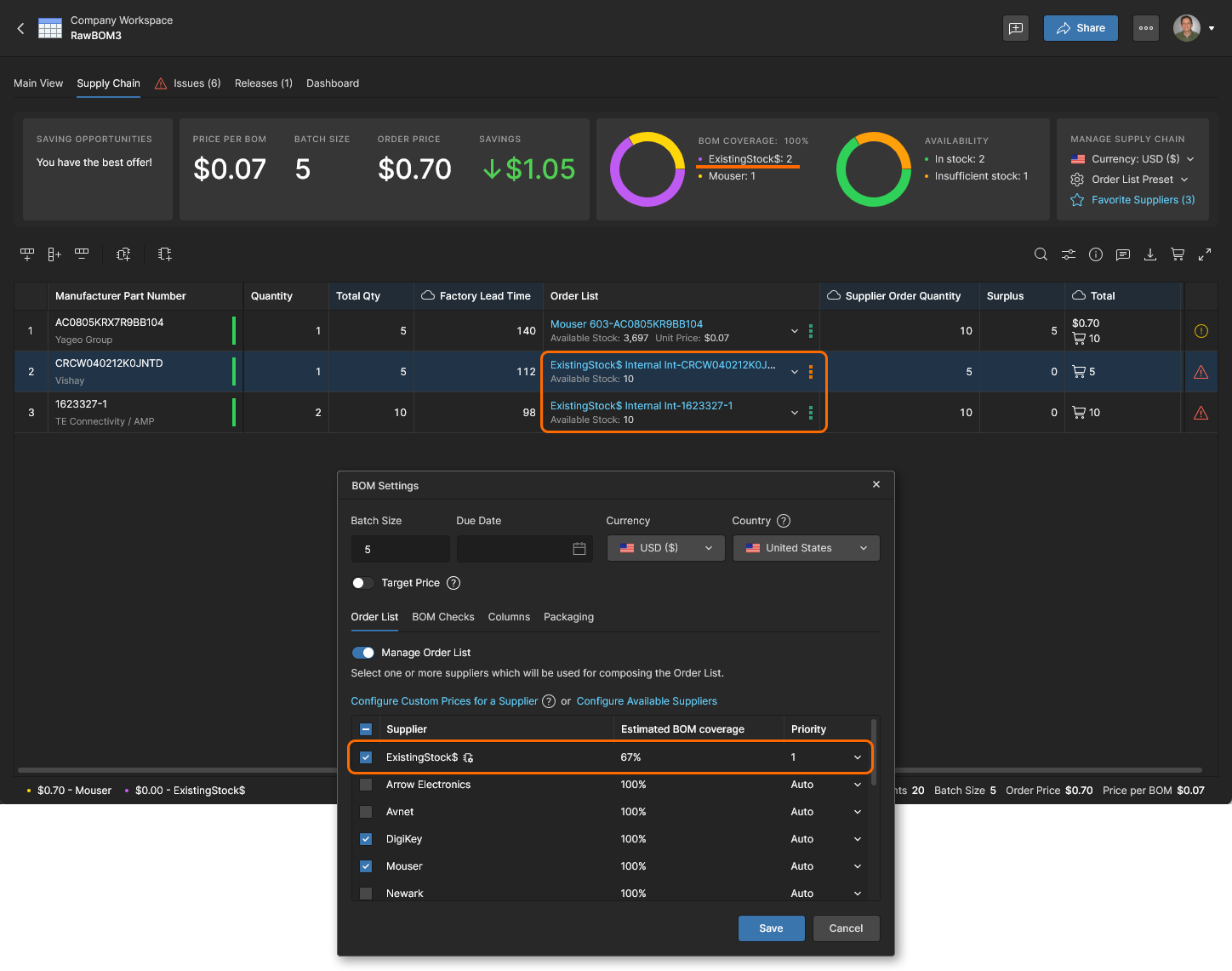 供应商 Order List 会由已启用供应商中可用的最低成本选项填充,但会受库存水平、最小订购量等供货因素的约束。请注意,从项目创建的托管 BOM 将最初使用该 项目的 BOM(ActiveBOM)中指定的供应商。