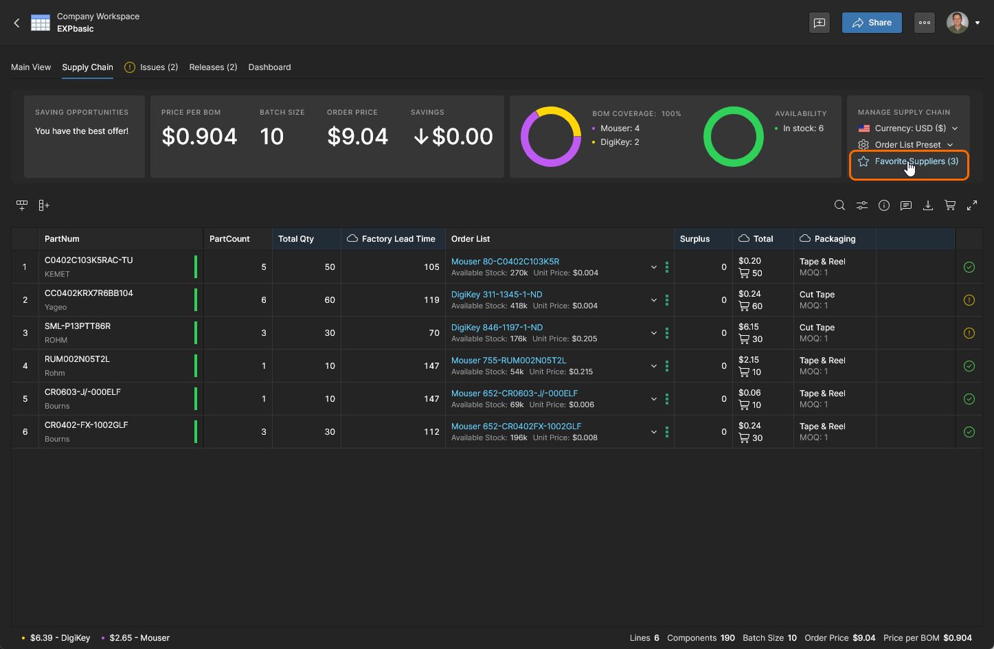 BOM 行条目将使用任一已启用零部件供应商提供的最佳采购报价(默认按最低成本)。选择 Favorite Suppliers 选项以在 BOM Settings 窗口中对供应商进行优先级排序。