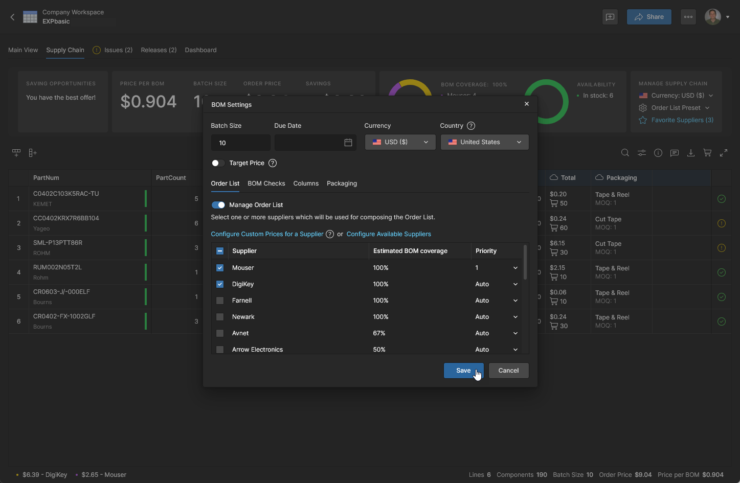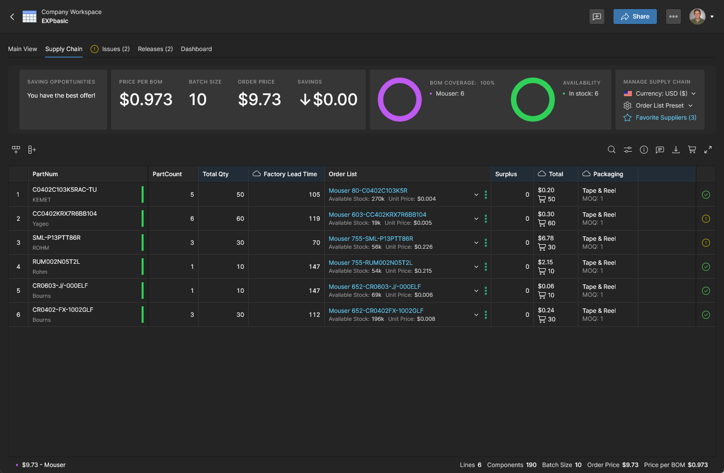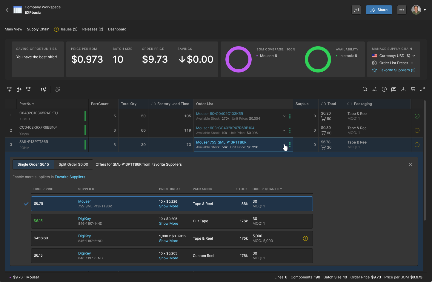 在指定更大的生产批量后,更新后的 Order List 供应商方案会呈现显著更低的成本,这也会反映在 BOM 条目列表上方的主价格汇总中(见 Price per BOM)。
