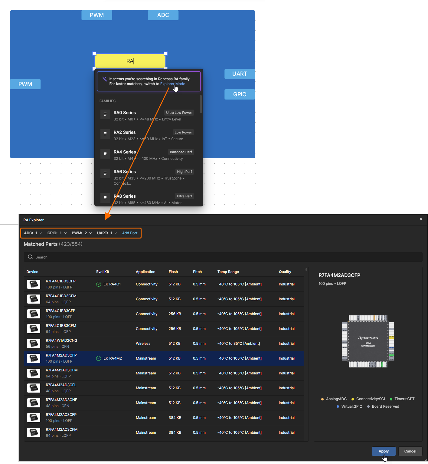 button to open the RA Explorer window and select another MCU if required.