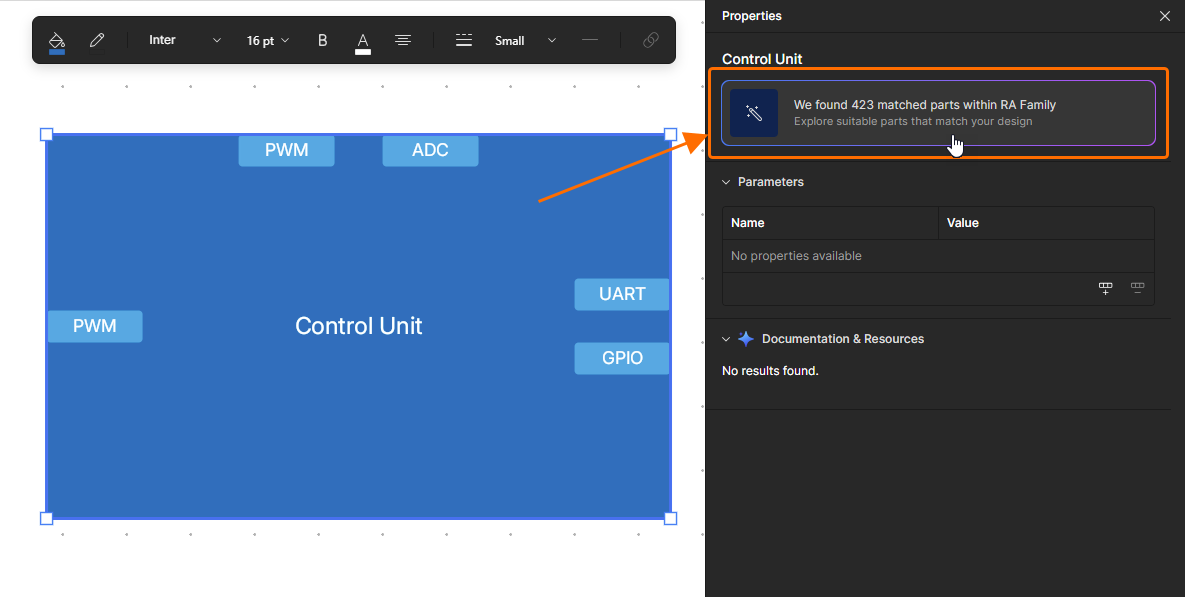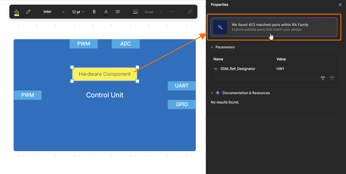 When searching for an MCU of the Renesas RA family, you can use the RA Explorer window to find the required component. Type RA or Renesas in the search bar after placing a hardware component and use the Explorer Mode link at the top of the pop-up to open the window where a list of suitable components will be presented. By default, the list will be constrained based on ports placed in the functional block. The current list of ports is shown at the top of the window. You can add ports of other types using the Add Port control and edit the required number of ports of each type using drop-downs. Click the required component in the list to select it and show its pin map in the right-hand side of the window. Click the