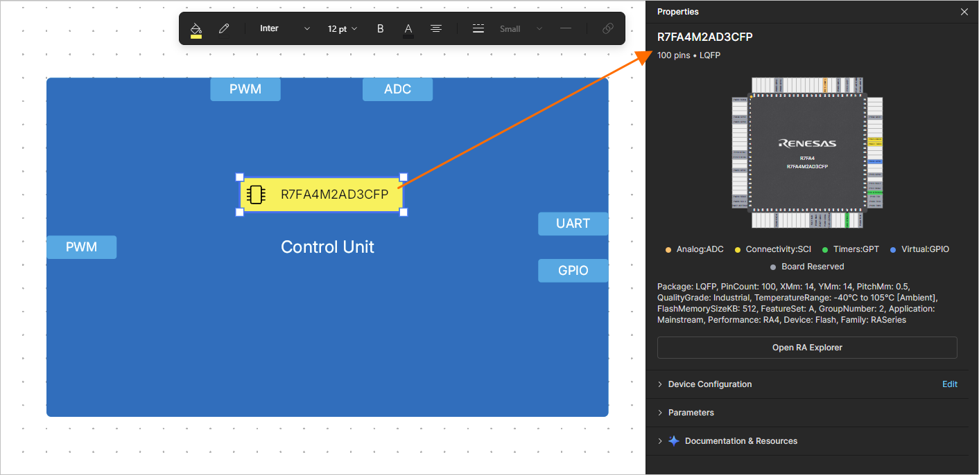 Once an RA MCU is applied to the hardware component object, select it and open the Properties pane to explore its properties. You can click the