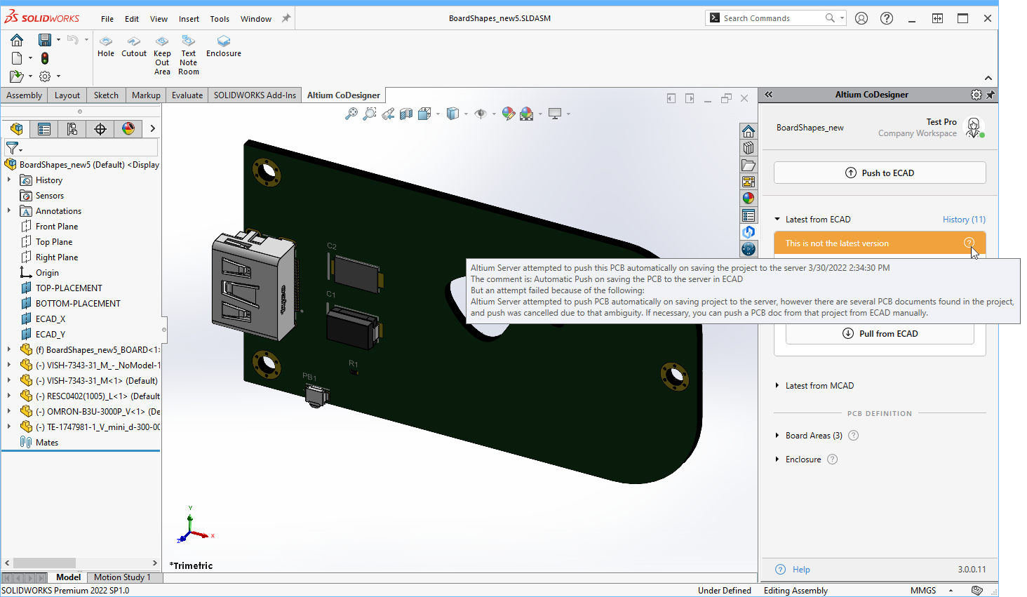 • Automatic Harness Push – (added in MCAD CoDesigner 3.14) the first time the harness project is Pulled from the Workspace into MCAD, that project is flagged as an MCAD CoDesigner project. From then on, whenever the project is Saved to Server in ECAD, it is also automatically Pushed to the Workspace, ready to be Pulled into MCAD. Auto-Push removes the burden of remembering to perform a manual CoDesigner Push after each save in ECAD. When the MCAD engineer performs a Pull, they are alerted if the last MCAD Push was automatic. If an automatic Push cannot be performed, the MCAD engineer is warned that the version of data they are pulling is not the latest ().