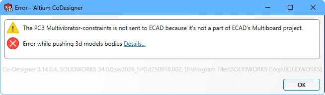 Adding a PCB in MCAD If an additional board has been added to the assembly in MCAD, when you attempt to Push from MCAD a CoDesigner message dialog will appear, warning that the additional PCB is not part of the ECAD multi-board assembly (). In this situation you must add that board to the Multi-board assembly in ECAD and then Push the project from ECAD to the Workspace. It is not necessary to Pull this update into MCAD, just Push the assembly from MCAD again and the additional board location and orientation information will be sent to the Workspace, ready to Pull into ECAD.