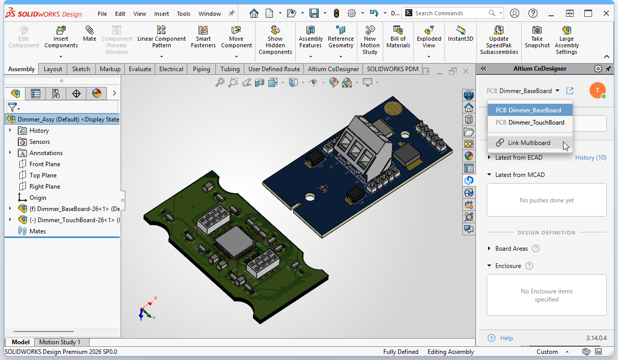 The next step is to link the MCAD device assembly to the ECAD multi-board assembly. If the PCBs have been recognized the button will no longer appear on the panel. In this situation you link by selecting the Link Multiboard command from the dropdown menu at the top of the Altium CoDesigner panel, as shown above. If the PCBs have not been recognized yet, use the Link Multiboard button on the Altium CoDesigner panel instead. This will perform the recognize process as well as linking.