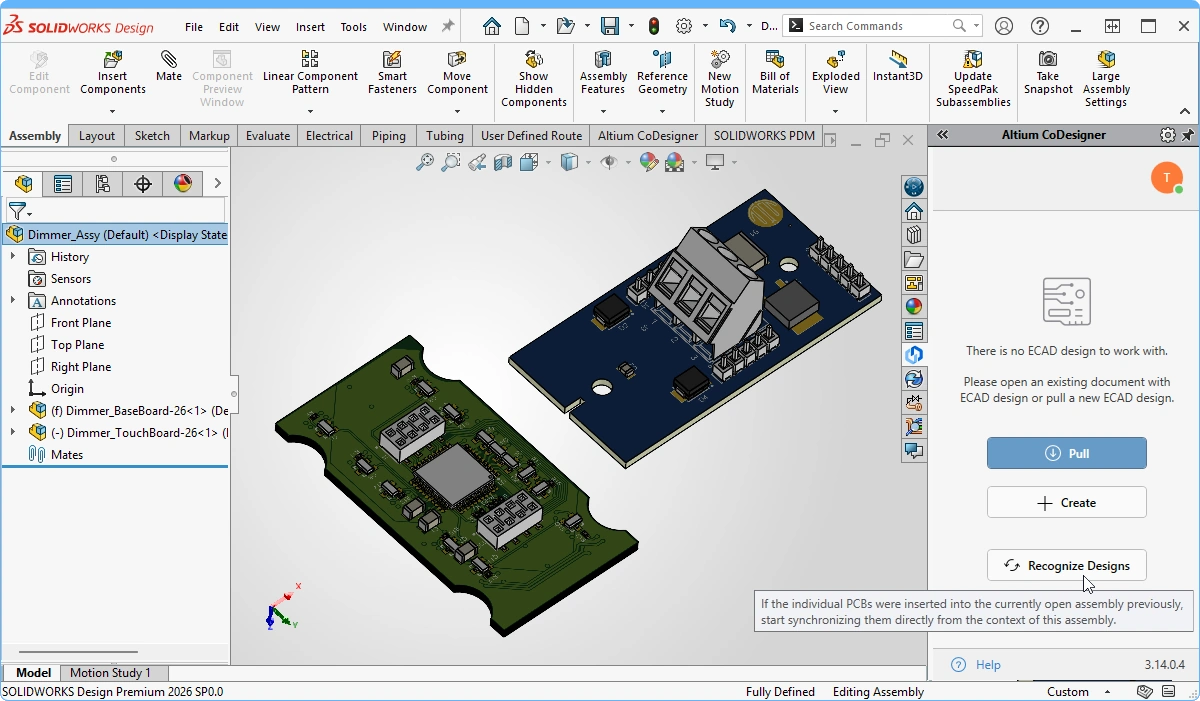 Once the PCB assemblies have been added to the MCAD assembly, click the Recognize Designs button. CoDesigner will identify each of the PCBs that it detects as being part of the MCAD device assembly.