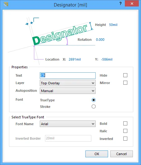 - Mirror - enable this option to flip the designator string across an axis that depends on the string's current Rotation and Location X/Y.