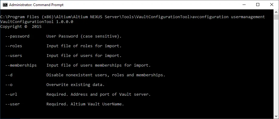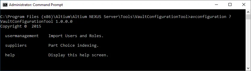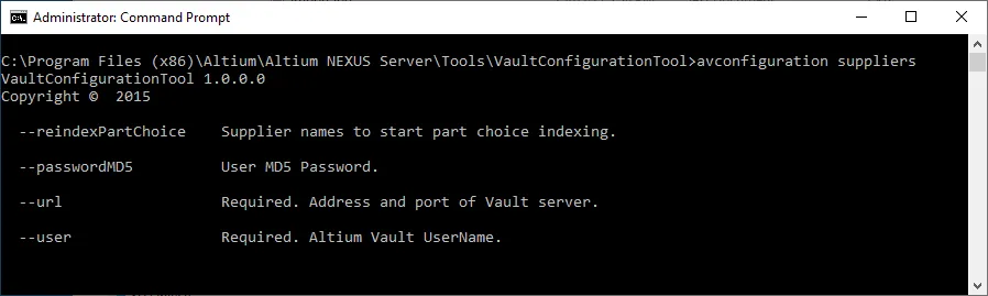 2. 导航到正确的文件夹。对于在主机计算机 C 盘上的默认安装路径,将是:cd C:\Program Files (x86)\Altium\Altium NEXUS Server\Tools\VaultConfigurationTool\