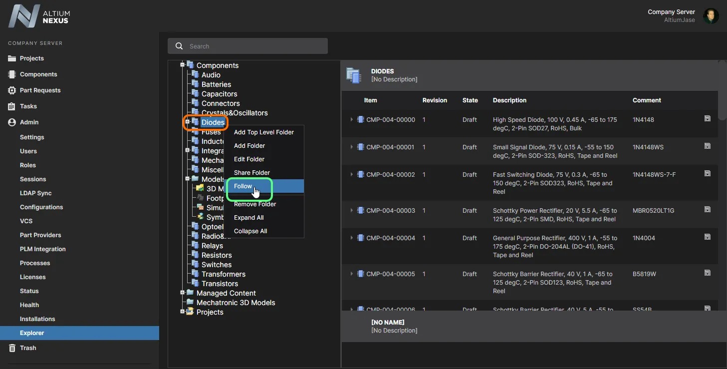 要接收与某个元件相关的电子邮件通知,您需要“订阅”该元件所在的父文件夹。这通过 following 该元件文件夹来完成。关注元件文件夹只能通过 NEXUS Server 的浏览器界面进行。操作如下: