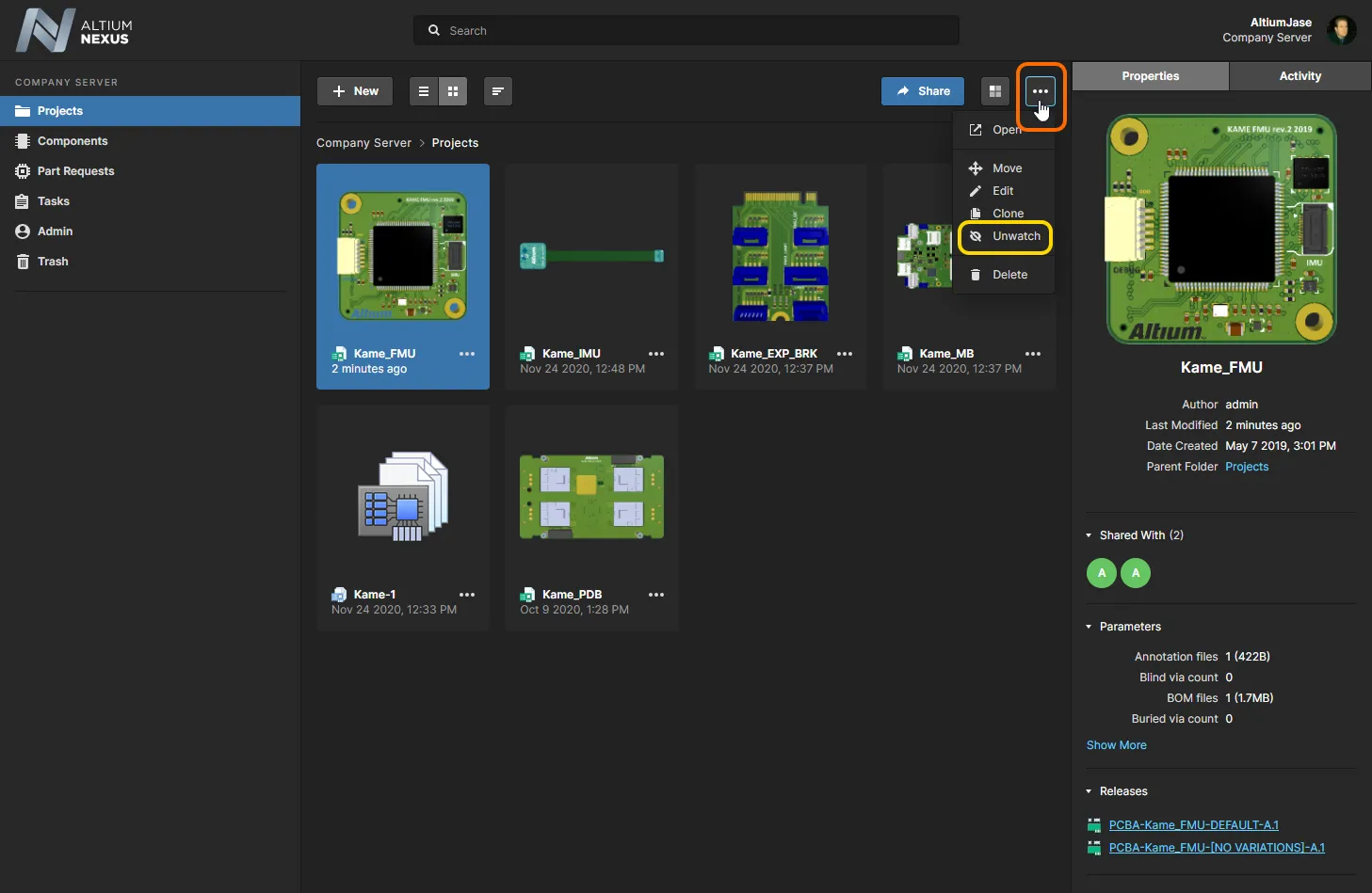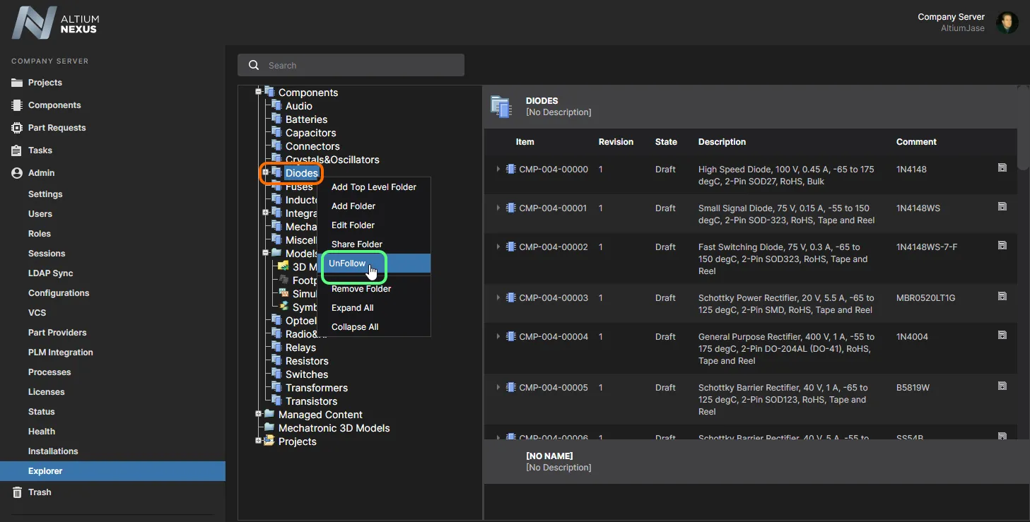 要停止关注元件文件夹,请右键单击该文件夹条目,并从上下文菜单中选择 UnFollow 命令。