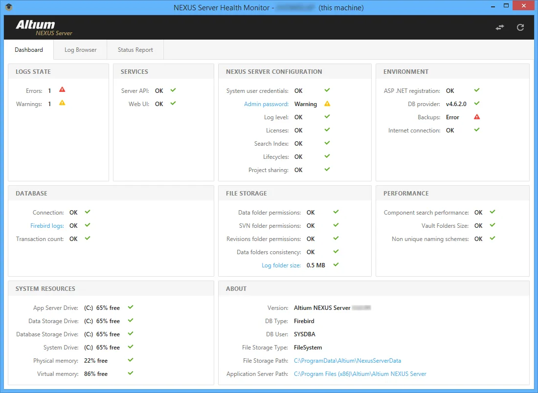 Enterprise Server 安装包包含全面的 NEXUS Server Health Monitor 工具,使管理员能够在本地快速确定并分析 Enterprise Server 的状态(或“健康状况”)。Health Monitor 作为随 Enterprise Server 安装提供的独立应用程序,可提供宿主机器状态以及 Enterprise Server 配置与服务的可视化摘要。其界面还包含与上下文相关的提示,以及重要位置与日志文件的相关信息和路径。