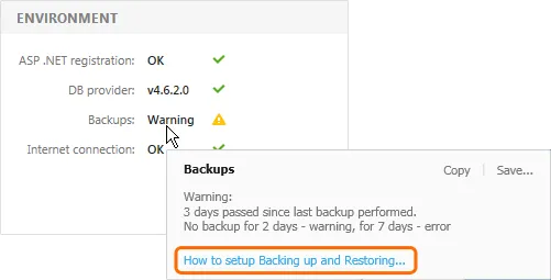在上方左侧示例屏幕中,Health Monitor 检测到 Enterprise Server 尚未进行备份。相关信息提供了指向文档的链接,以帮助解决该问题。
