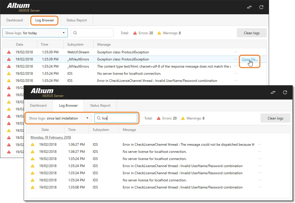 Health Monitor 的 Log Browser 屏幕可通过 Log Browser 选项卡访问,它会呈现来自 Enterprise Server 所有可用日志文件中的错误与警告条目——这些日志通常位于 C:\ProgramData\Altium\NEXUSServerData\logs 文件夹中。要查看包含该事件条目的日志文件,请选择相应的 Open file 链接,或直接双击该条目本身。