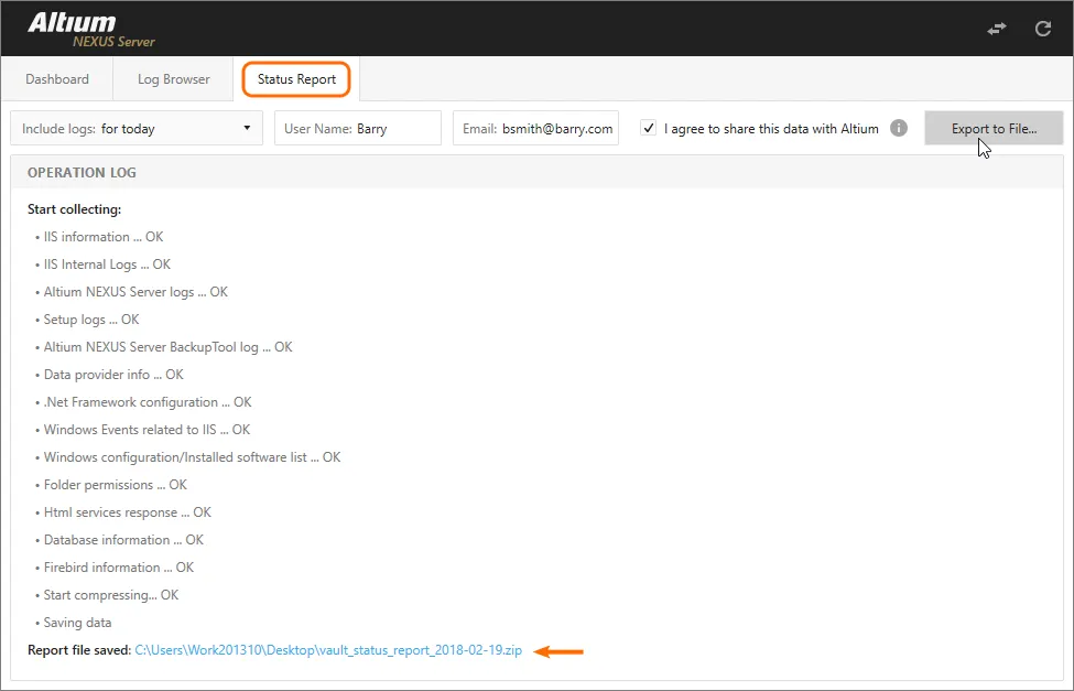 通过 Status Report 选项卡访问的 Health Monitor 的 Status Report(状态报告)界面,用于创建并显示 Enterprise Server 状态报告文件。生成的报告会将所有事件调试信息汇总到一个 Zip 压缩包(*.zip)中,必要时可发送给 Altium Developers。