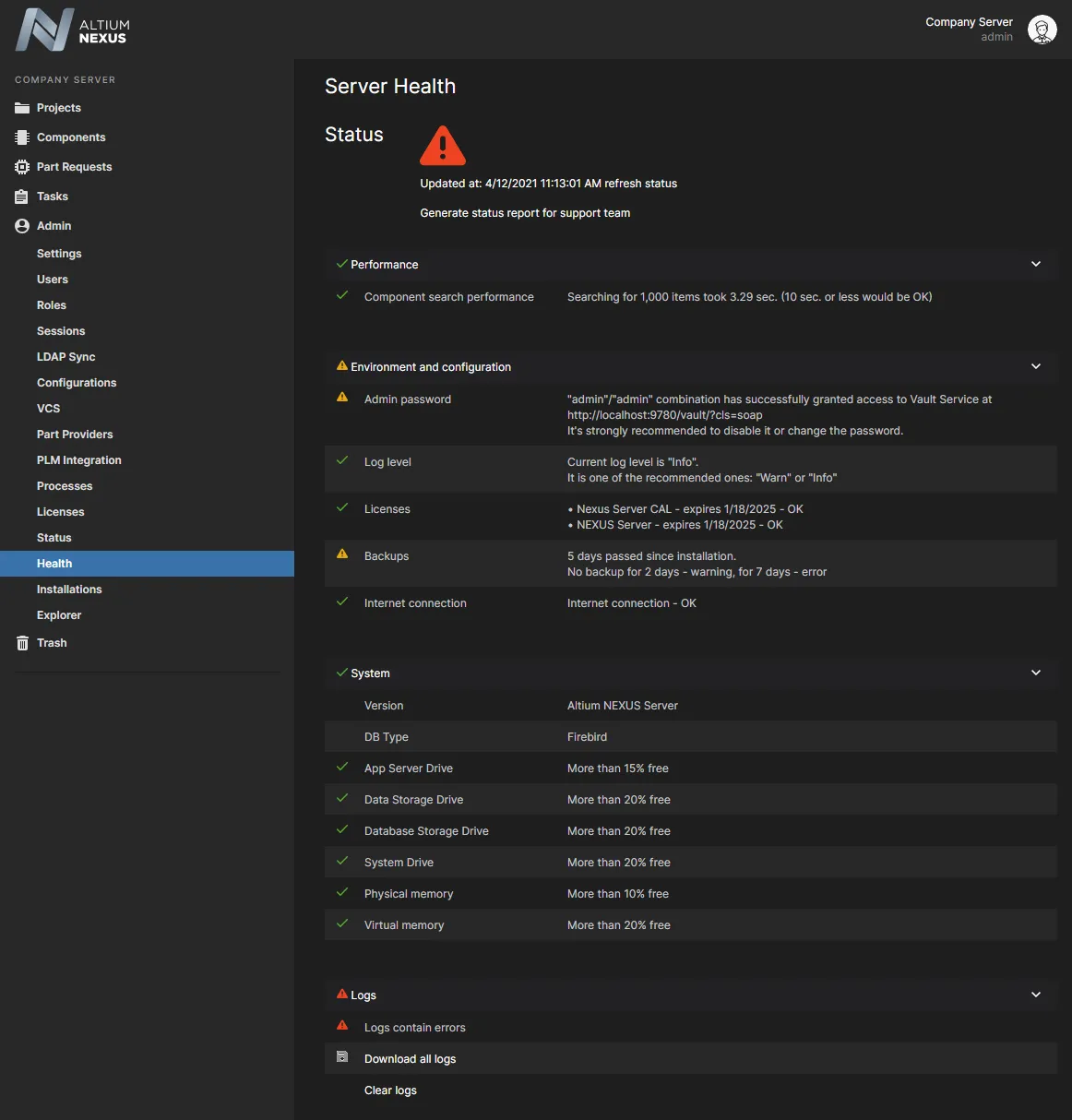 作为 Enterprise Server 状态的高亮概览,Server Health 页面会为需要关注的状态条目提供清晰的警告/错误图标及相应说明。常见告警包括:数据备份逾期、许可证即将到期、存在活动的 admin/admin 用户账户,或在日志文件中检测到错误条目: