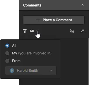 • From – only present comment threads that a specific person started, replied to, or has been mentioned within. Choose a person from the associated drop-down list, which includes all people who have actively participated in commentary for the project.