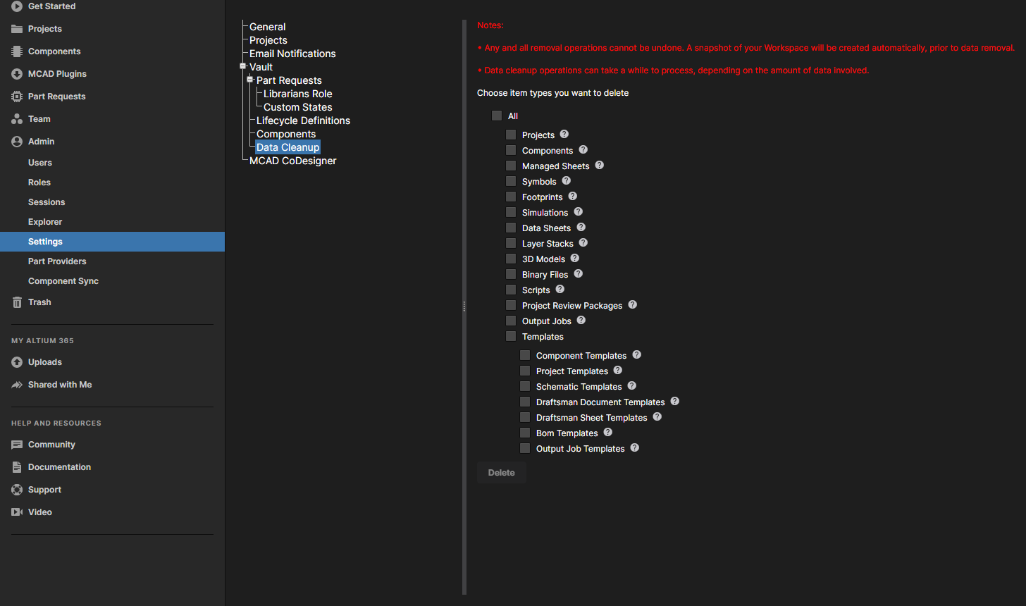 您可以通过支持的网页浏览器,使用管理员权限在Admin部分的Settings中,访问Altium 365 Workspace的Data Cleanup功能。