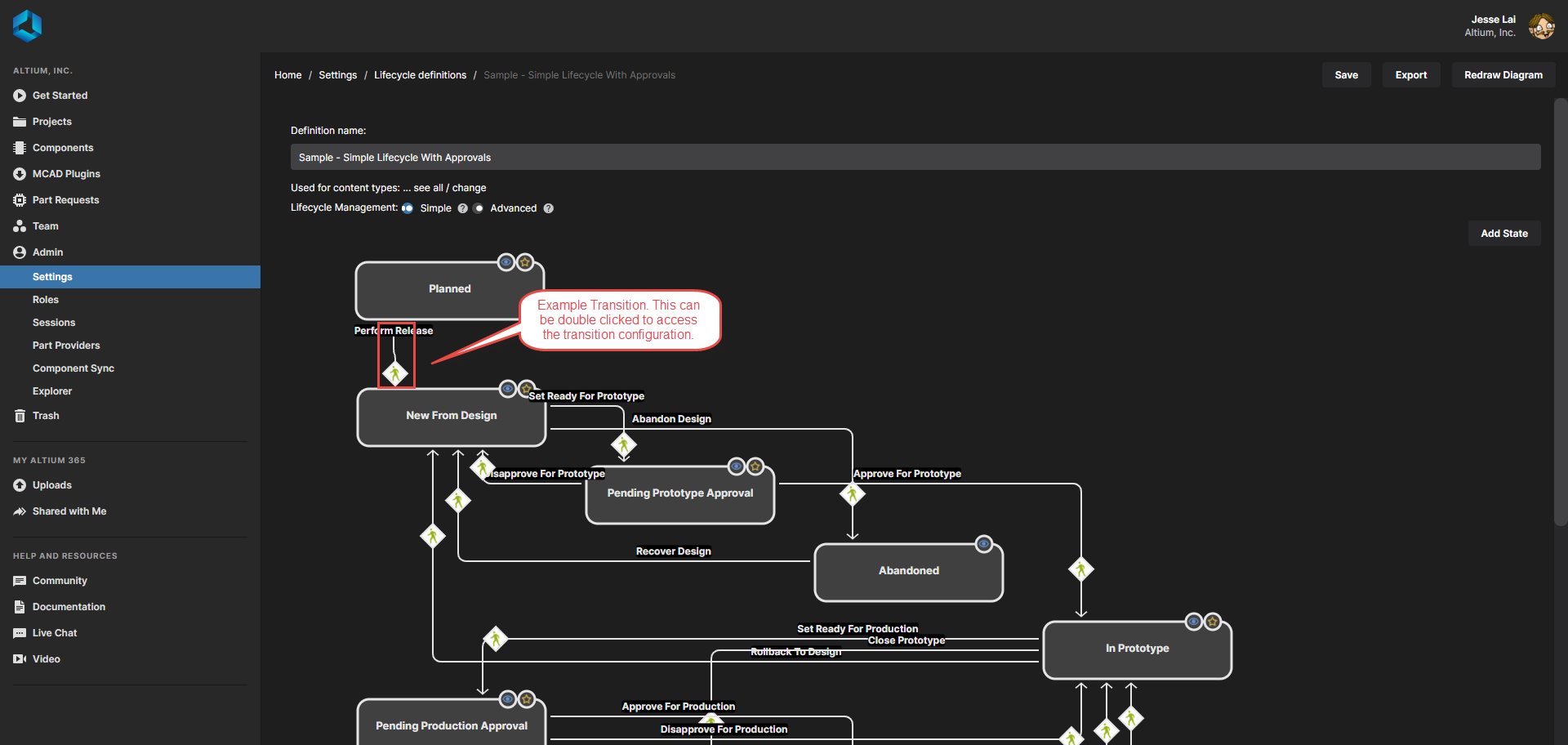 在网络浏览器中,查看Altium 365工作区时,请首先进入Admin选项卡,然后进入Settings。在网页中间选定Lifecycle Definition后,您将能够编辑现有生命周期或创建新生命周期。通过双击状态之间箭头所示转换,您将能够控制生命周期受控组和审批组。