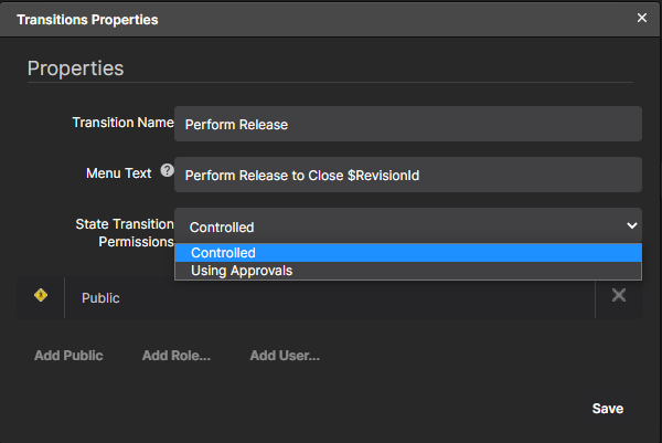 - 在Permissions部分中,有一个State Transition Permissions部分。对于Altium 365 Pro级,请将下拉选定内容设置为Controlled。对于Altium 365 Enterprise级,如果想要使用审批,则可以将下拉选定内容设置为Using Approvals。