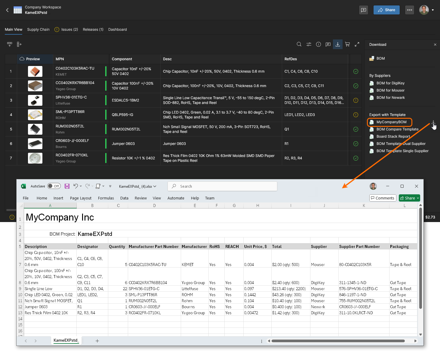 Download: Save the complete BOM listing with or without a BOM Template, or save a sub-set of the listing based on a specific Supplier in your purchasing Order List. Files are saved to the browser's default location in CSV format (*.csv), or when a Template is selected, in Excel (*.xlsx) format.