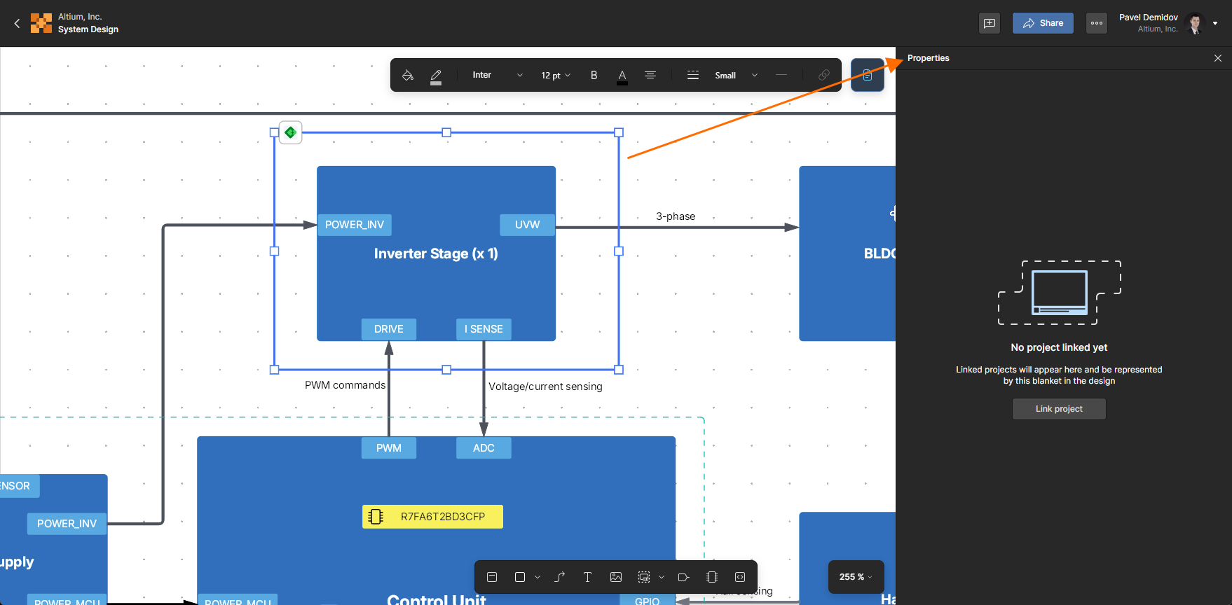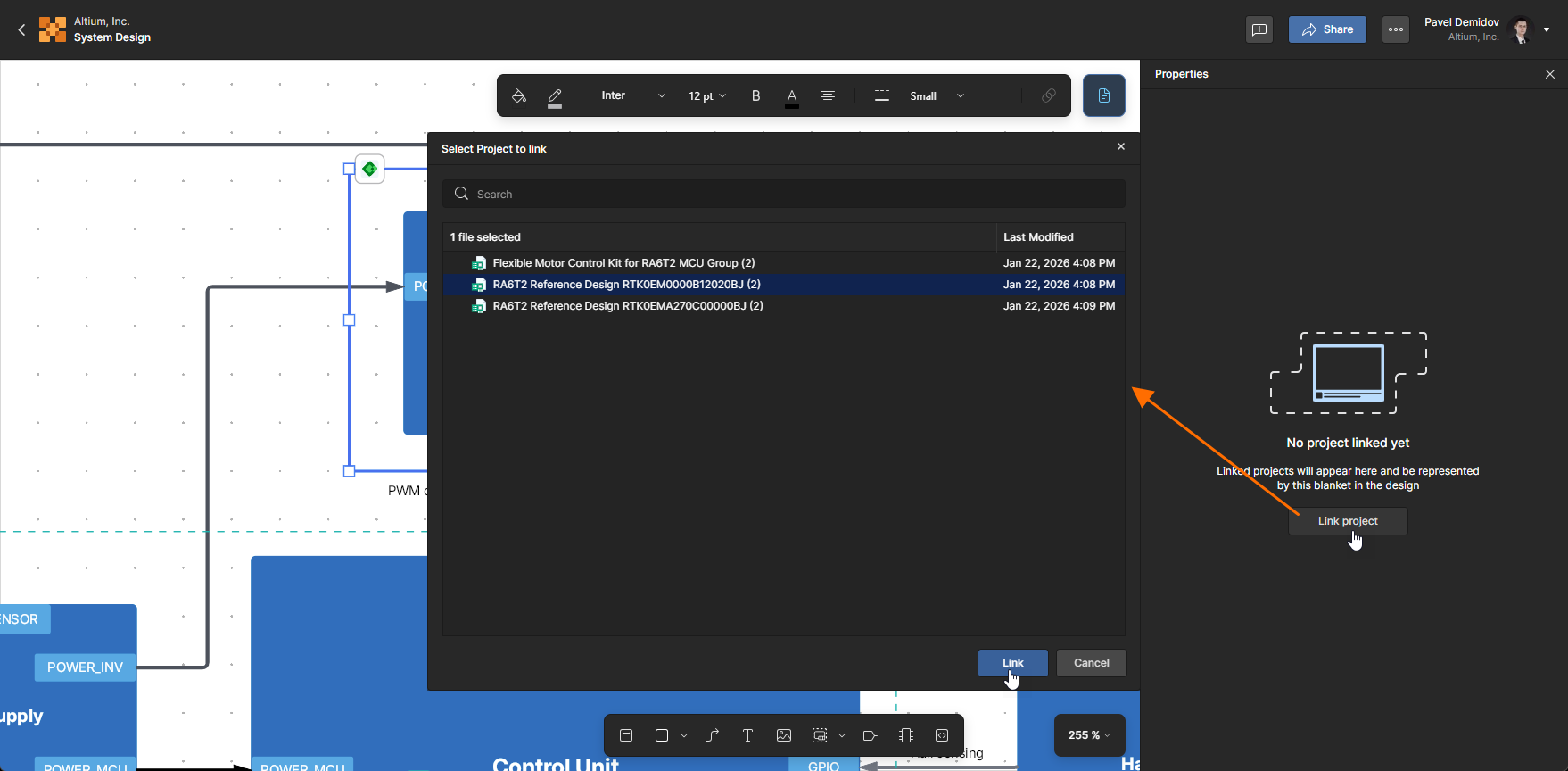 To link a hardware blanket to a PCB project or software blanket to a software project, select the blanket in the design space and click the