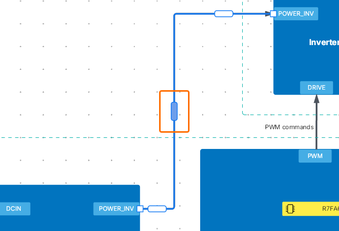 To start placing a connection line on the boundary of a functional block or port, you can also hover the cursor over the boundary (without selecting the block/port) and then click-and-drag when the cursor changes to a crosshair.