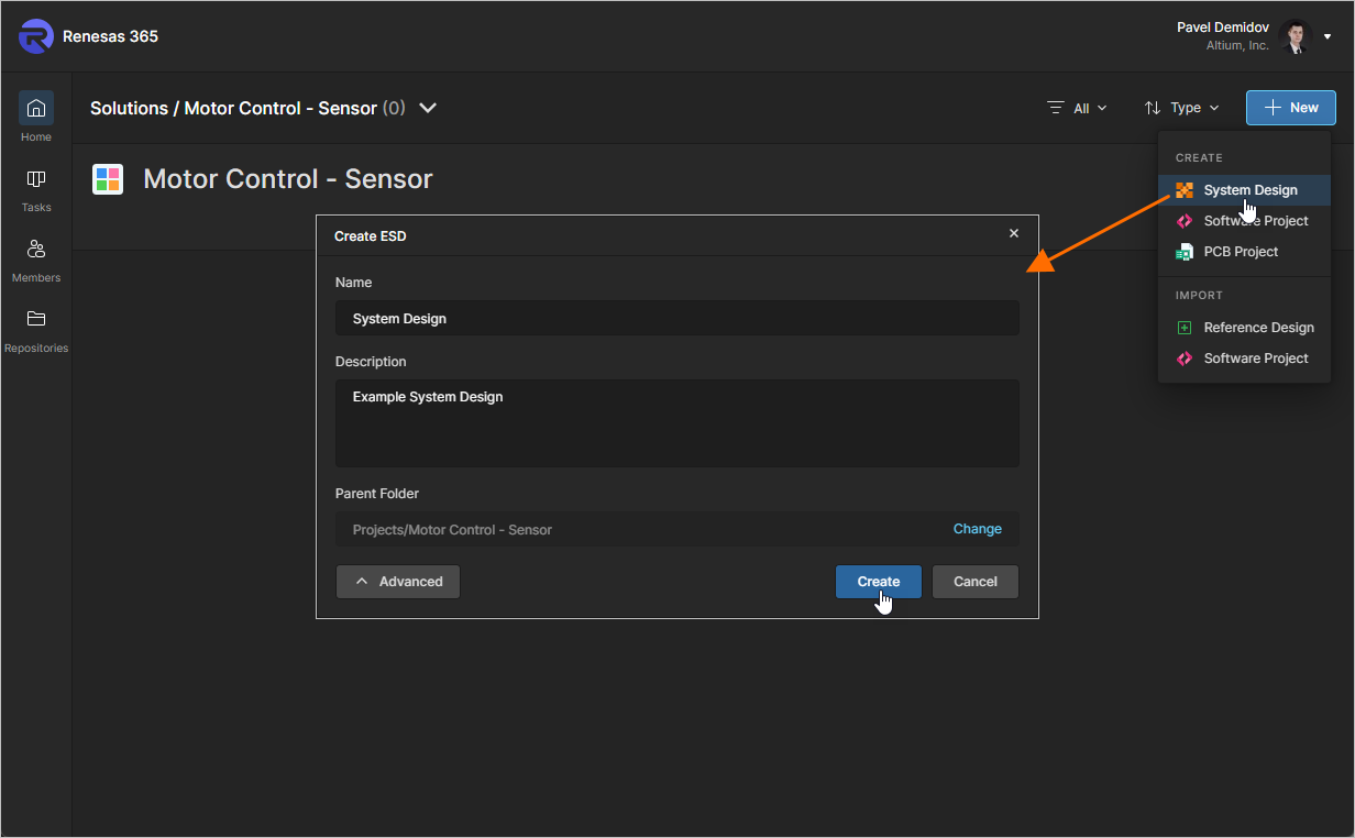 button at the top right and select System Design from the menu that appears to open the Create ESD window.