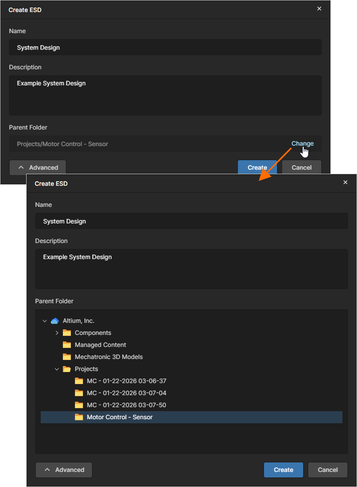 button. The Parent Folder field will present. Use this field to specify where the ESD document is to be created within the Workspace's folder structure. By default, this is the Projects folder. Click the Change link at the right of the field to access the folder structure for the Workspace, from which to select an alternate folder to store the document (