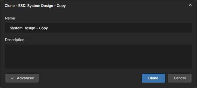 Clone – use this command to access the Clone - ESD window that provides the controls to make an identical copy of the ESD document (