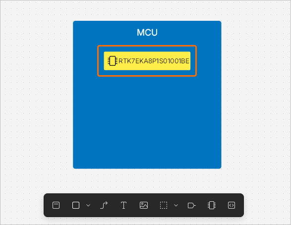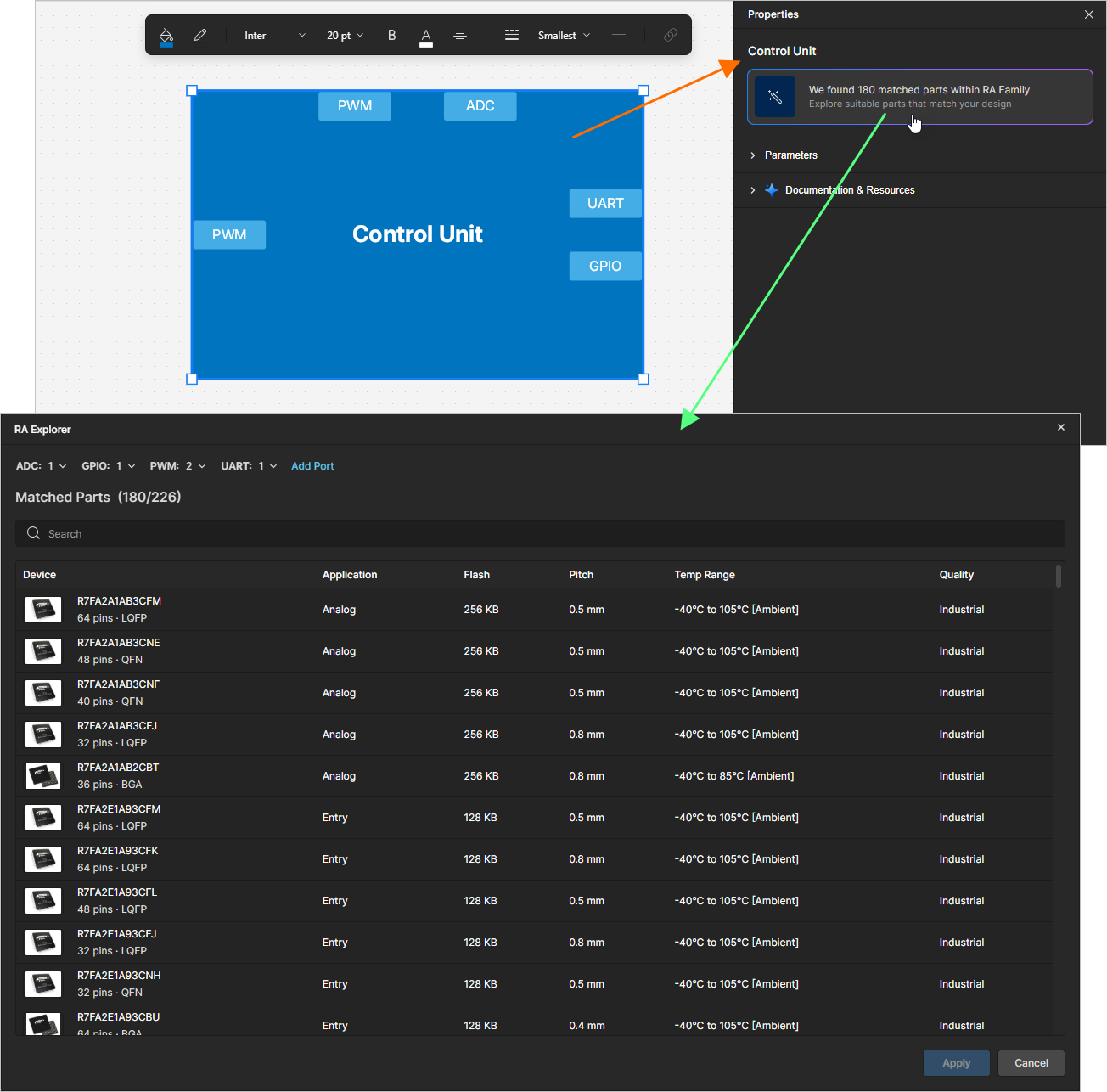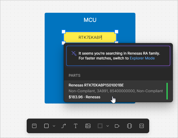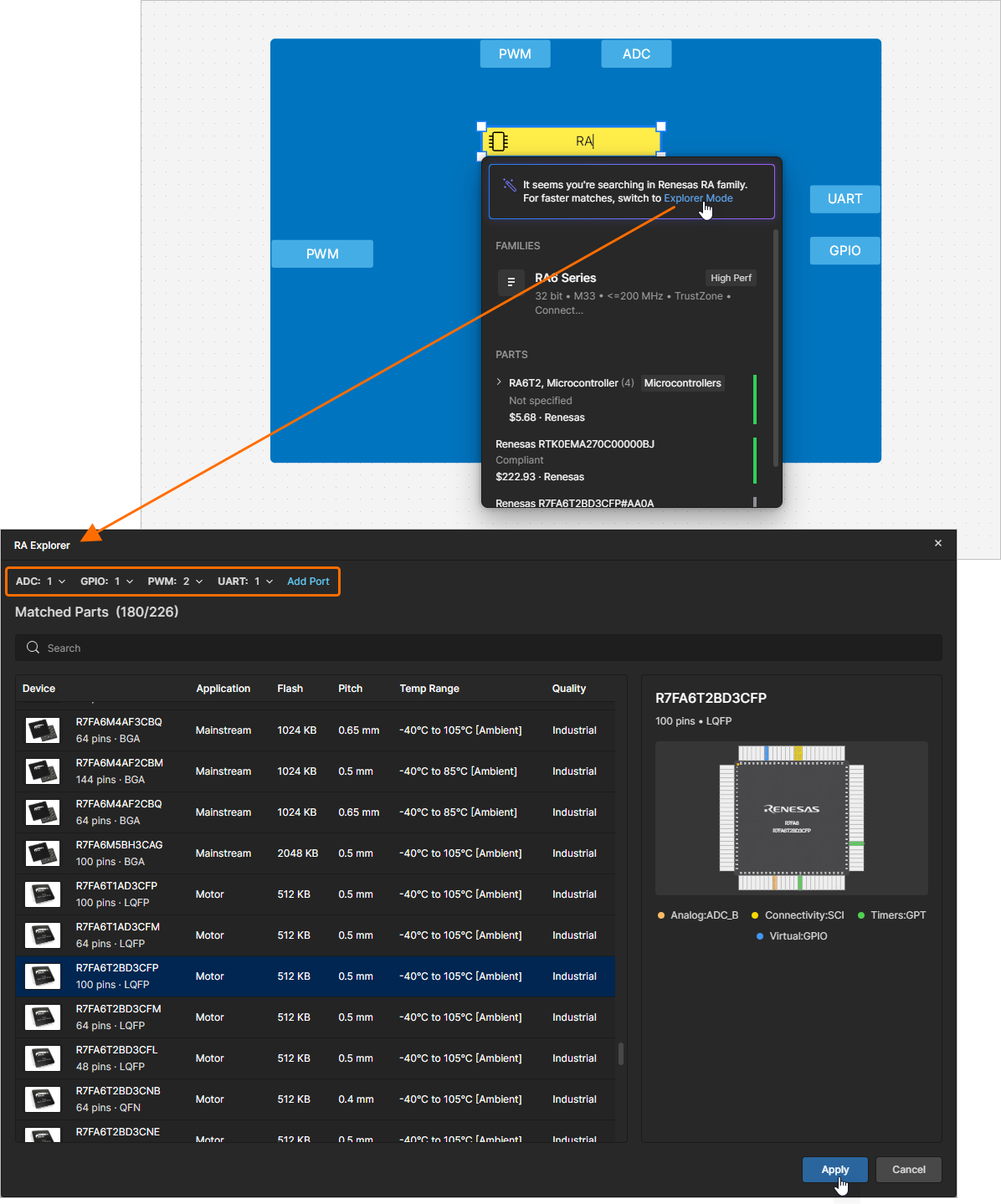 When searching for an MCU of the Renesas RA family, you can use the RA Explorer window to find the required component. Type RA or Renesas in the search bar after placing a hardware component and use the Explorer Mode link at the top of the pop-up to open the window where a list of suitable components will be presented. By default, the list will be constrained based on ports placed in the functional block. The current list of ports is shown at the top of the window. You can add ports of other types using the Add Port control and edit the required number of ports of each type using drop-downs. Click the required component in the list to select it and show its pin map in the right-hand side of the window. Click the