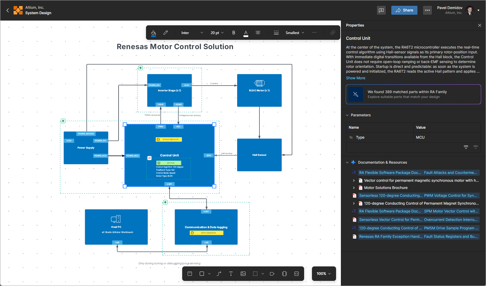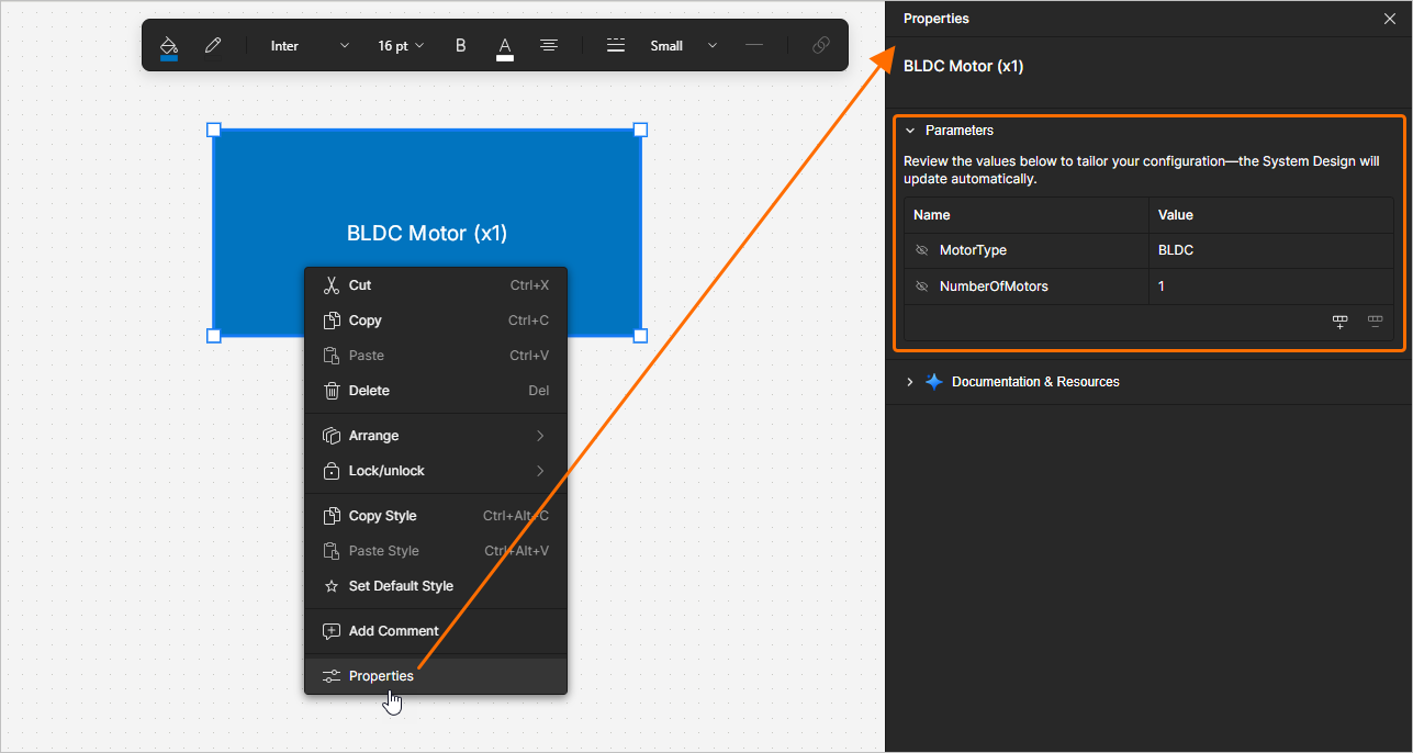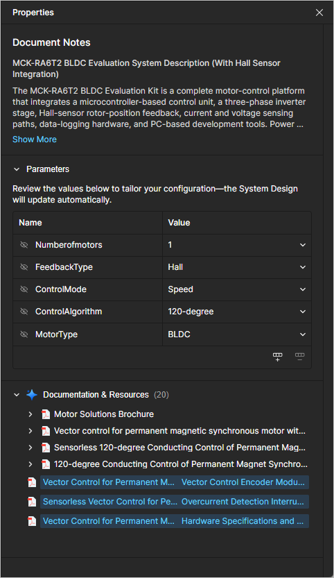 The Documentation & Resources region of the Properties pane provides an automatically formed list of links to resources (Renesas documentation, PDFs) related to the solution and its elements.