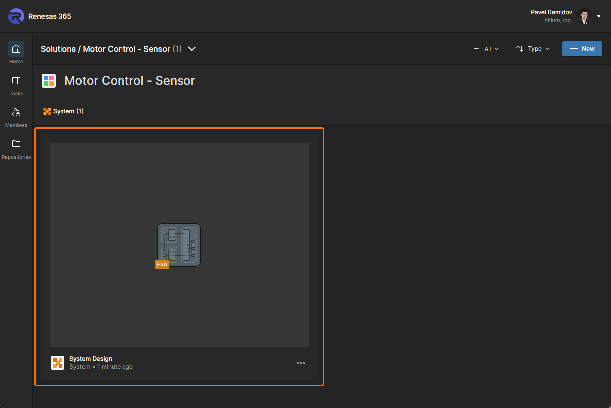 A new ESD document can be created as part of a solution that resides in your Renesas 365 Workspace. On the detailed page of a solution, click the