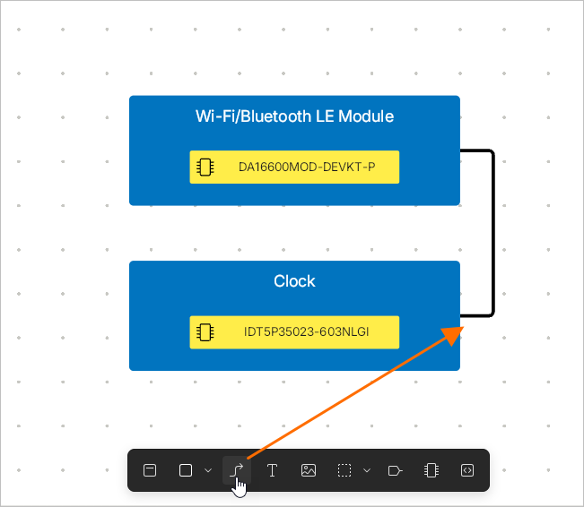 button in the bottom toolbar. Click the point at which you want to start the connection line. Position the cursor then click to anchor a series of vertex points that define the shape of the connection line. Note that the connection line will automatically avoid crossing functional blocks. Right-click to finish placement of a connection line in free space of the document. After placing a vertex on a functional block, port, or placed connection, placement of the current connection is finished automatically.