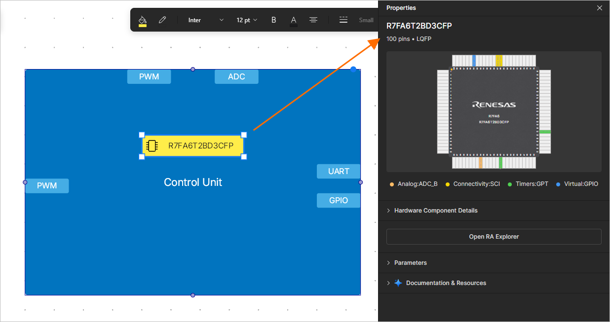 ) is selected. Once the required component is selected in the RA Explorer window, a hardware component will be automatically placed within the functional block (if not already), and the selected component will be applied to it.