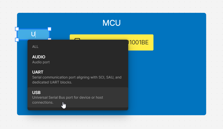 button in the bottom toolbar. The cursor will change to a crosshair, with a component preview attached to it. Click within boundaries of a functional block to place the component. Double-click a placed component and use the search bar in the pop-up window that opens to search for a component. Select a component in the list of search results, and the name of this component will appear within the graphic of the functional block.
