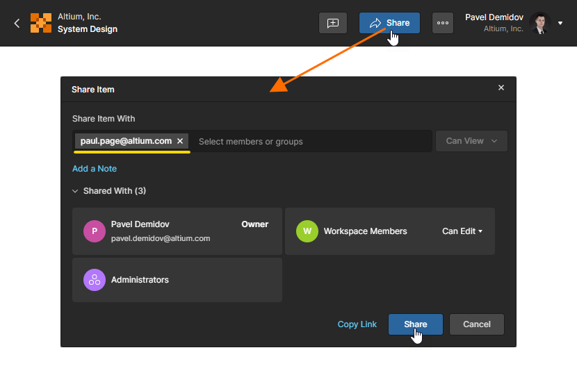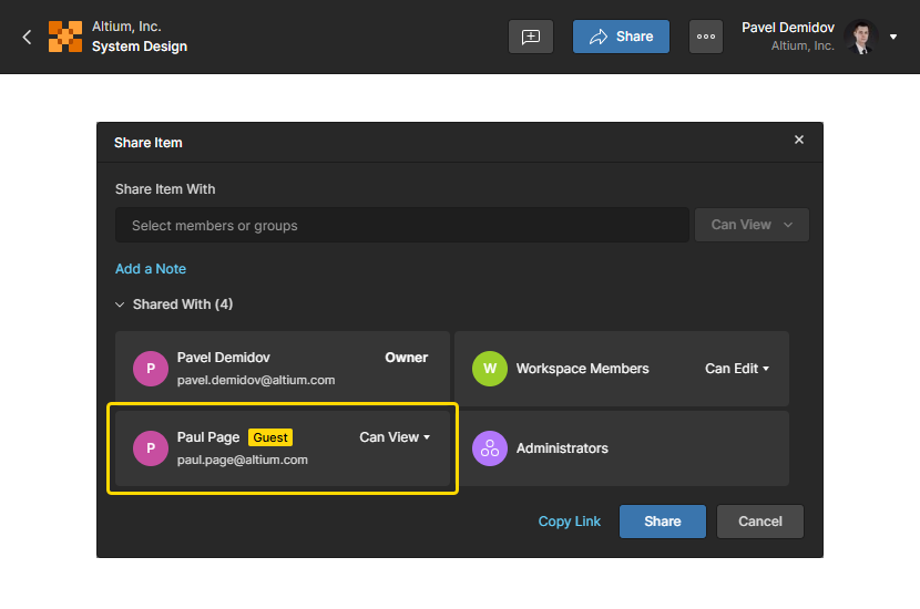 button at the top right of the ESD document to open the Share Item window. Select the Share Item With field to access and enter the full email address of the user. The user will have Guest-level access to the shared ESD document through their own Workspace or Personal Space.