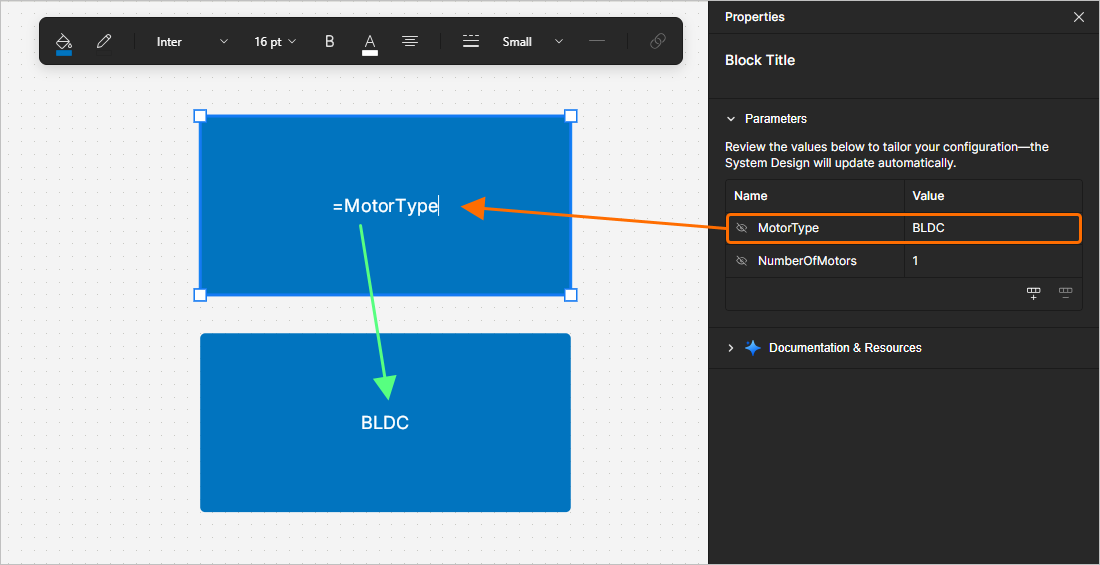 While texts (text objects, names of functional blocks, etc.) can be used to display static, user-defined text in the ESD document, they can also be used as placeholders for document and object parameters. To use a special string in an ESD document, include a parameter name in the text of an object. Special strings are characterized by the prefix = (e.g., =ControlAlgorithm, =MotorType, etc.).