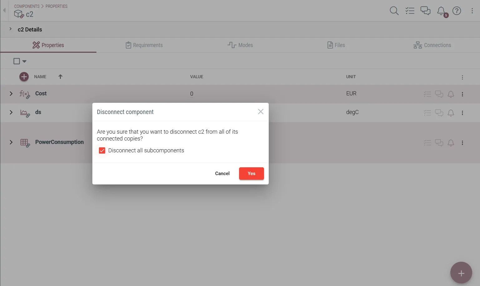 Components - Check-box to 'Disconnect component' pop-up is added to be able to disconnect subcomponents