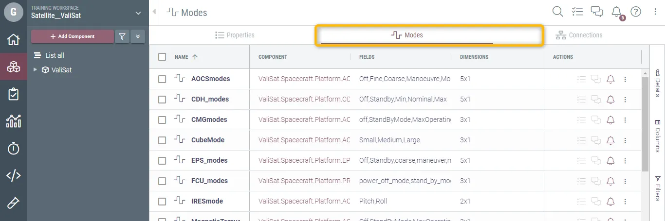 In the new version in the Components module, you can see a list of all the modes that have been used in the project and the associated components to the module.