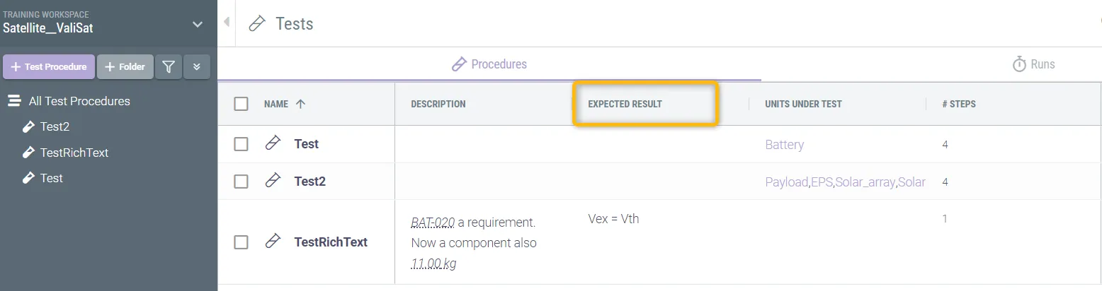 Now Valispace gives an option for the user to define the expected result for Test procedures.