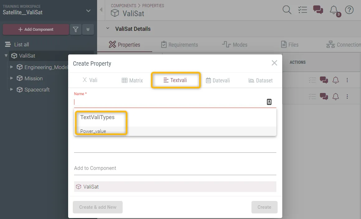 Now Valispace autocompletes the ‘TextVali Types’ in the ‘Create Property’ popup of the Components module.