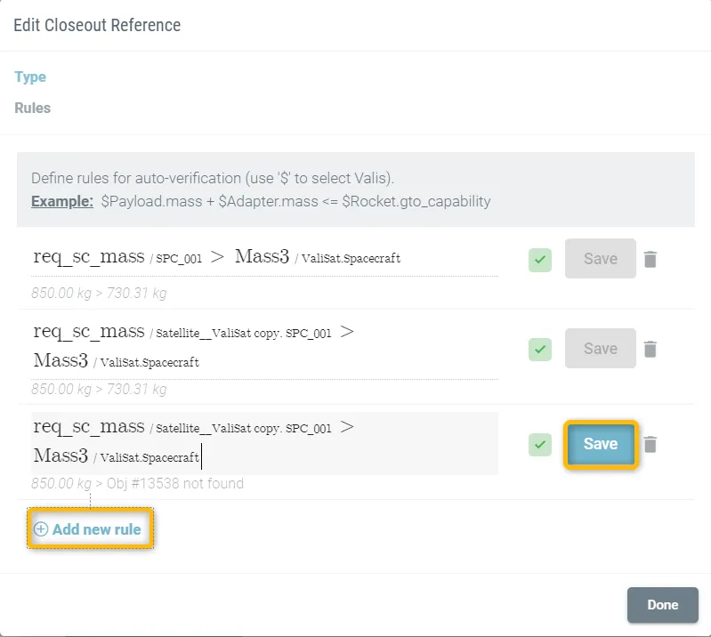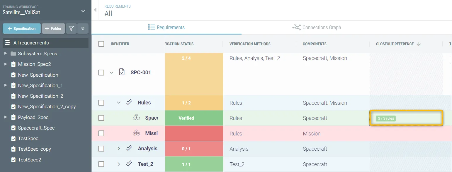 For adding or changing the requirement rule, expand the requirement and in the particular component row, the rule can be added or changed in the ‘Closeout reference’ column directly: